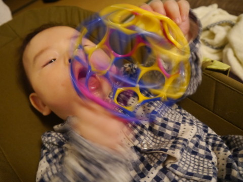 ・オーボールをつかんでなめる。