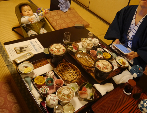 和室に椅子とテーブルだと、Ray君は楽しそうにハイハイやつかまり立ちで自由に遊ぶし、大人はRay君の手の届かないテーブルに置かれた食事をゆっくり頂ける。